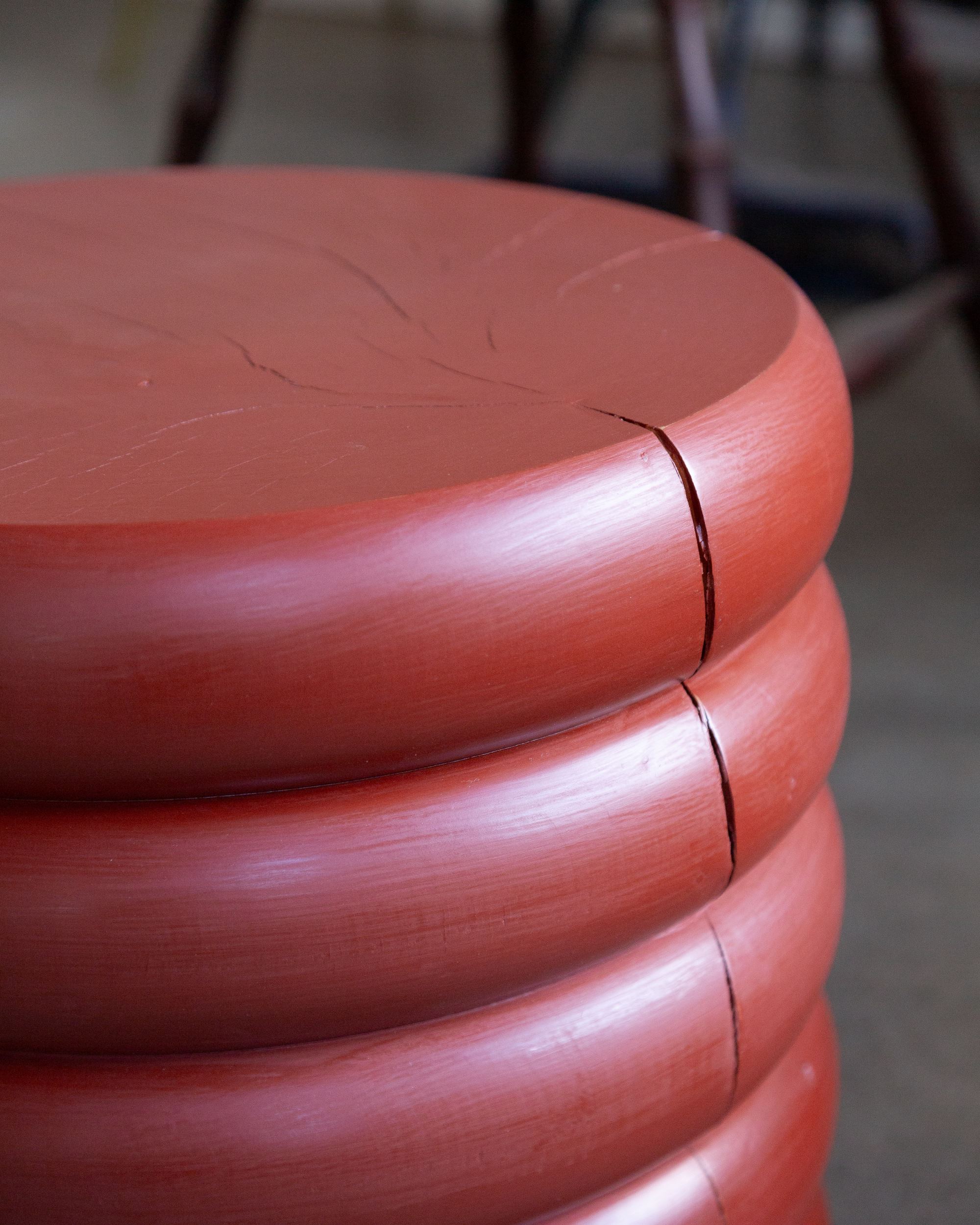 The Fold Side Table is solid in structure and sculptural in form. Turned from a solid section of timber, the natural cracks and knots will move and change as it ages. Each piece is made in a small batch, hand brushed with traditional milk paint or blackened using a Japanese charring technique—Shou Sugi Ban.